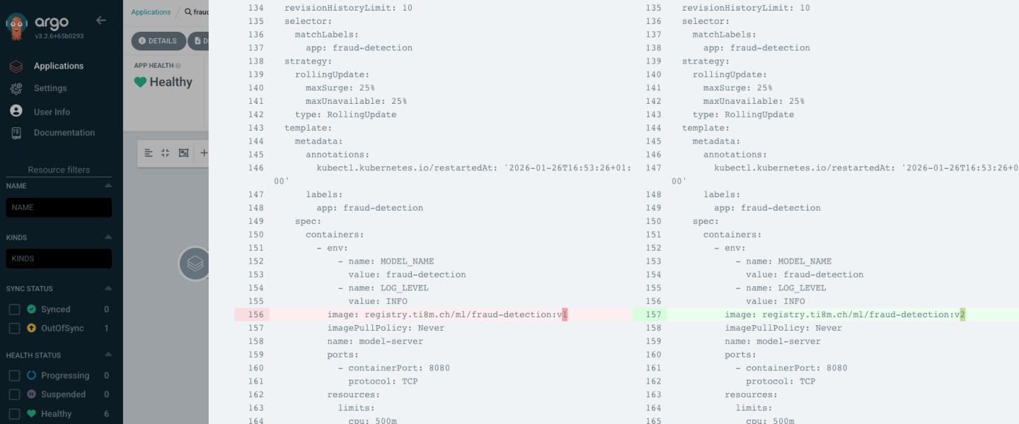 The data scientist (or the pipeline) doesn’t update the cluster directly, but a commit is made in the gitops-repo instead. This is our audit trail. Years later, we’ll still be able to say: “Model V2 was rolled out at 14:03 on January 14, 2026.”